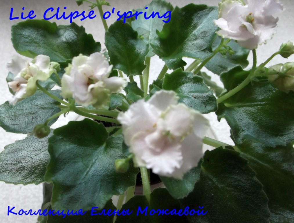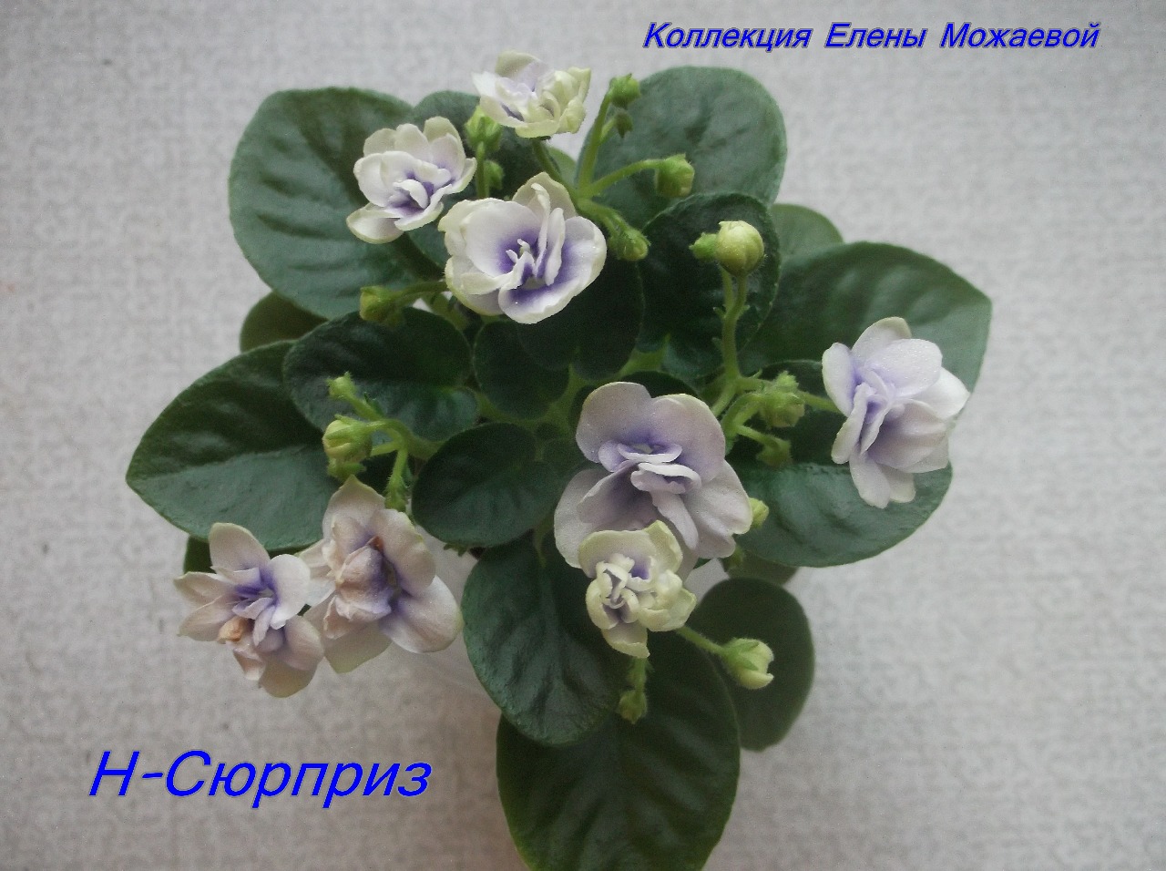 Крупные, махровые белые с синим центром цветы с волнистыми краями лепестков, светло-зеленая стеганая листва. Полумини.
