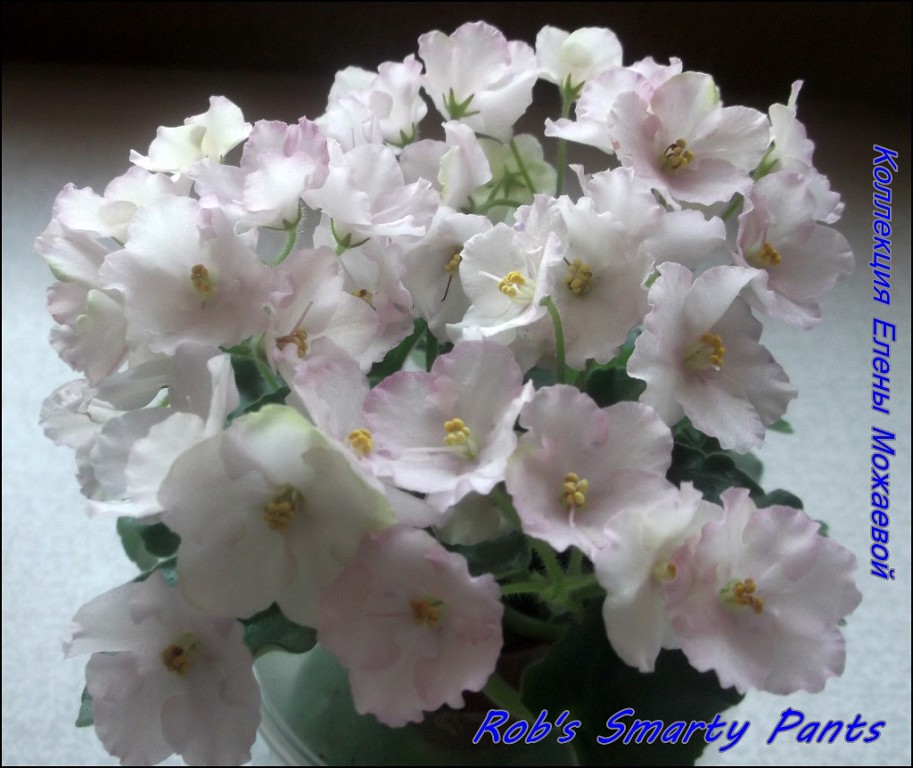 Махровые или полумахровые белые анютины глазки с зеленой оборчатой каймой. Шелковистая ярко-зеленая листва с волнистым краем; красивая кружевная розетка. Полуминиатюра.