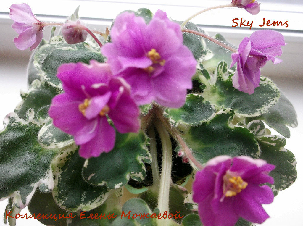 Полумахровые белые бахромчатые звезды с теплыми брусничными лучами из центра. Красивая оливково-зеленая зубчатая листва с белой и золотистой пестролистностью. Полуминиатюра.